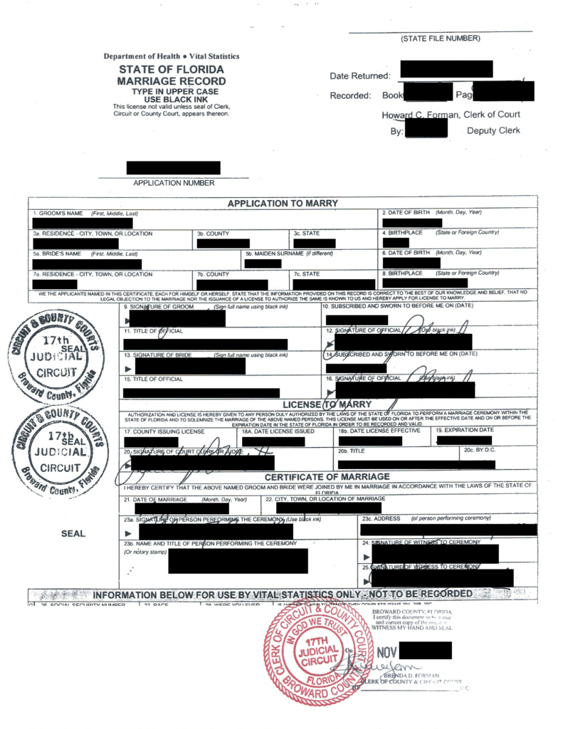 Žádost a povolení k sňatku, oddací list/Application and License to Marry Marriage Certificate Florida