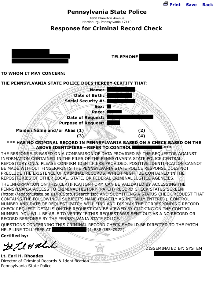 Výpis z restříku trestů, Pensylvánie/Criminal check
